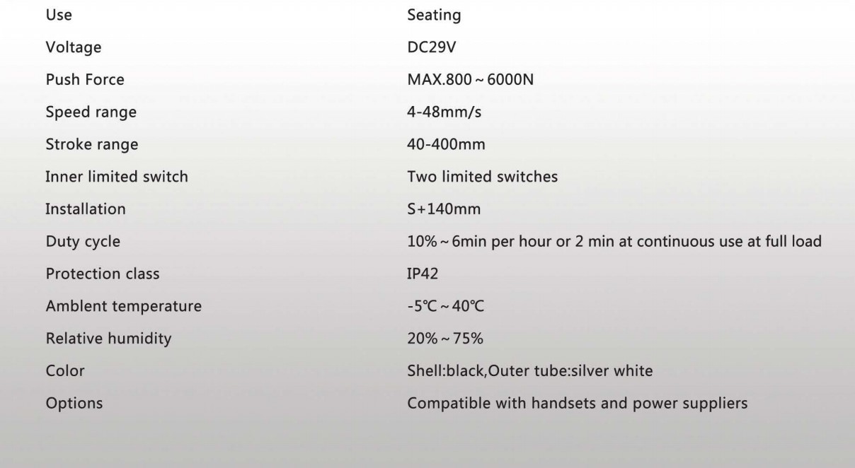 本產品已通過CE、UL、PSE、ISO9001認證,它有一個新穎的外觀和制作精良,噪音小,操作簡單,讓它成為暢銷國內外,被廣泛用于電動沙發、醫療床、手術床,按摩椅等。